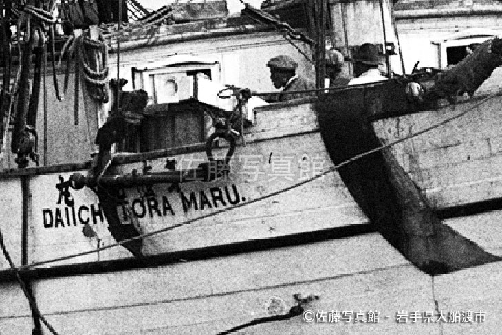 写真a-③では「虎丸」と読める文字が確認できます。一方、b-①ではローマ字で「DAIICHI TORA MARU.」と記されていることから、写真に写る船は「第一虎丸」であると判断できます。