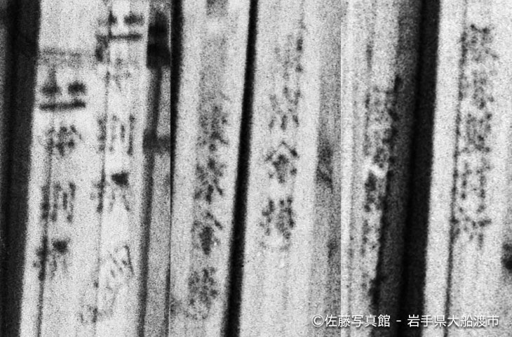 第一虎丸が三陸・東京間の木材輸送に従事していた――この記述と符合するような情報を、乾板に写る木材に見ることができます。そこには以下の文字が記されています(□は判読できない)。